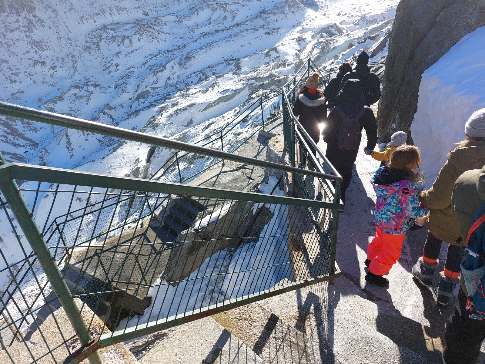 It is currently 502 stairs to get down to the glacier cave. About 30 steps are added to this path each year to reach the glacier that is currently in a receding age. In the 1700s, it was in a growing phase and started to push into the town of Chamonix. The bishop sent word for a priest and had the glacier exorcised so that it would stop destroying the town. About 30,000 years ago, this glacier filled the entire Chamonix valley. It was sort of a sad visit because I know this glacier will probably not exist in a few decades. There's a lot of political pressure around climate change topics and I consider myself an environmentalist. At the same time, I'm a realist and acknowledge that this trip and the town of Chamonix wouldn't exist if this glacier hadn't receded. I'm sure in a few thousand years, after humanity's reign on earth, this glacier will return to its former glory.
